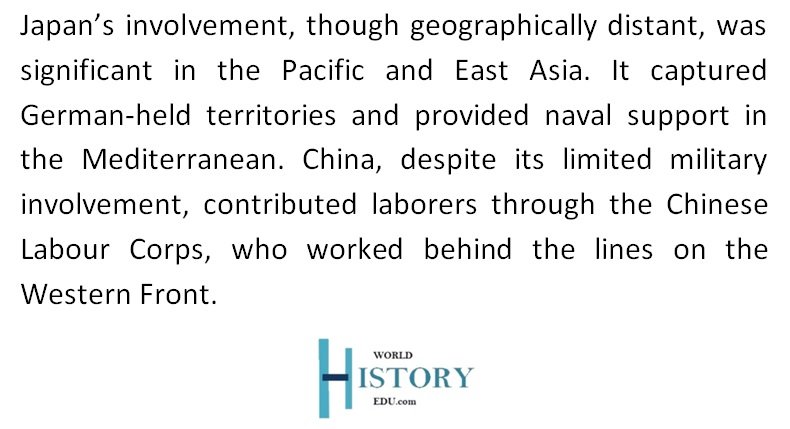 - Japan (1914): Declared war on Germany, aiming to seize German-held territories in the Pacific and China.