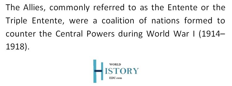 The Allies, also known as the Entente Powers or Triple Entente, represented one of the two major international coalitions during World War I (1914–1918). Comprised initially of France, the United Kingdom, and Russia, the Allies grew throughout the conflict to include the United States, Japan, Italy, and numerous other nations and colonies, opposing the Central Powers, which were led by Germany, Austria-Hungary, the Ottoman Empire, and Bulgaria.