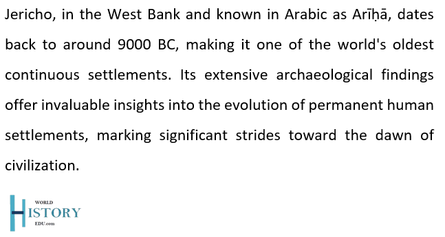 Jericho is often cited as one of the oldest continuously inhabited cities in the world, with evidence of settlement dating back to around 9,000 BC or earlier. The archaeological remains of a tower and wall from the Pre-Pottery Neolithic age at Jericho are among the world’s earliest known fortifications.