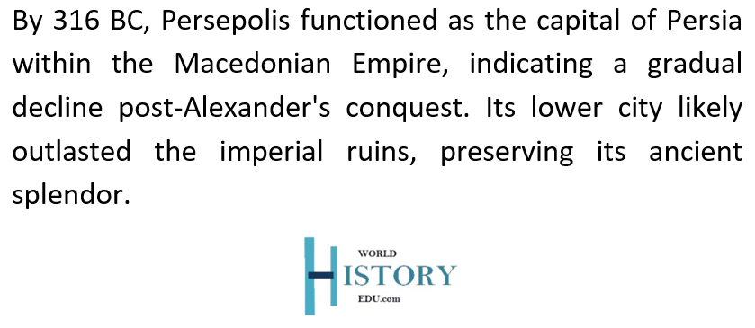 The demise of Persepolis came swiftly at the hands of Alexander the Great in 330 BC, who, in a symbolic act of vengeance or perhaps to mark the end of the Achaemenid dynasty, set fire to the city.