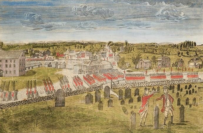 An engraving by American artist Amos Doolittle, depicting the British entering Concord.