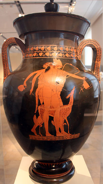 The Berlin Painter, active circa 490–460s BC, is the name assigned to a prominent Attic Greek vase-painter renowned for his exceptional talent in the early 5th century BC. Image: Dionysos holding kantharos (drinking cup) on Side A of Attic red-figure amphora, c. 490-480 BC, Vulci, Italy.