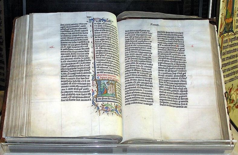 A handwritten Latin Bible exhibited at Malmesbury Abbey in Wiltshire, England.