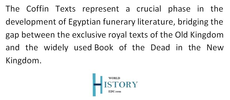 The Coffin Texts reflect an increasing concern with the afterlife among a broader segment of society, introducing new themes of morality, transformation, and structured afterlife geography.
