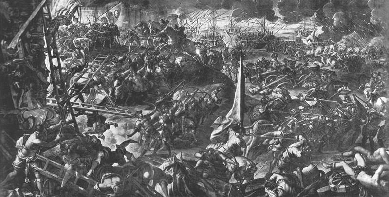 An illustration depicting the siege of Constantinople in 1204. Artwork by Italian painter Palma il Giovane.