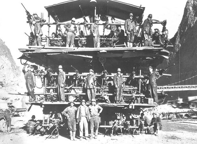 Workers operate a Jumbo Rig, a machine used for drilling tunnels during the Hoover Dam construction.