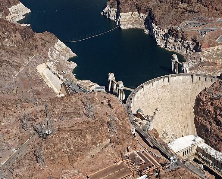 The Hoover Dam, completed in 1936, stands as a symbol of American ingenuity, engineering, and resilience. Built during the Great Depression, it is located on the border of Arizona and Nevada and straddles the Colorado River.