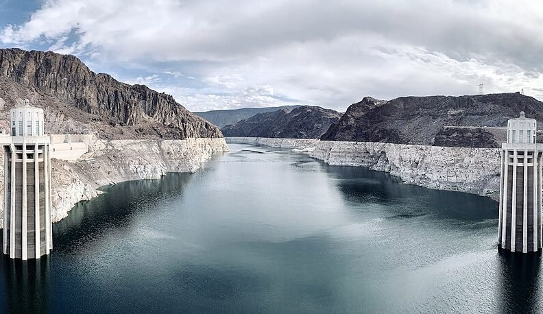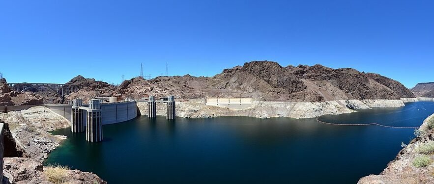 Hoover Dam created Lake Mead, one of the largest man-made reservoirs in the U.S., and is located near Boulder City, Nevada, a town originally built to house construction workers. The dam’s generators supply power to Nevada, Arizona, and California. Image: Lake Mead from Hoover Dam, October 2021.