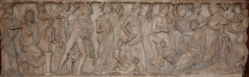 Image: Prometheus creates man: Clotho, Lachesis with Poseidon, and likely Atropos with Artemis appear on a Roman sarcophagus (Louvre).