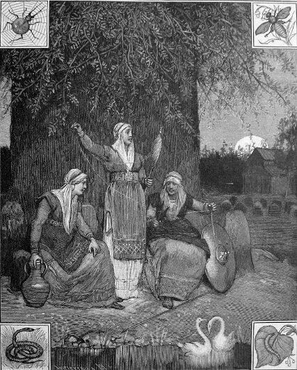 The trio of Fates (Norn) that live near Urdarbrunnr (Urdr’s Well) are known for deciding the fates of people. Image: Norns (1832) from Die Helden und Götter des Nordens, oder das Buch der Sagen
