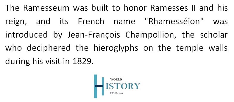 The name “Ramesseum” was coined by Jean-François Champollion, the French scholar and philologist who deciphered the Rosetta Stone, during his visit to the ruins in 1829. The original Egyptian name of the temple was “The House of Millions of Years of Usermaatre Setepenre, united with Thebes in the domain of Amun,” reflecting Ramesses II’s throne name.
