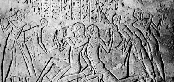 Image: A carved relief from the Kadesh inscriptions depicts Egyptian soldiers beating Shasu spies, capturing a moment of interrogation during the conflict.