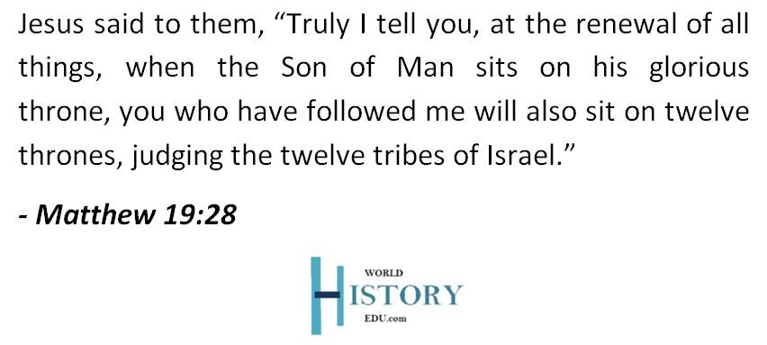 The New Testament references the twelve tribes multiple times. Jesus promises his disciples that they will “judge the twelve tribes of Israel” in the Kingdom of God (Luke 22:30, Matthew 19:28). The Book of Revelation lists twelve tribes (excluding Dan) as those who will be sealed for salvation.