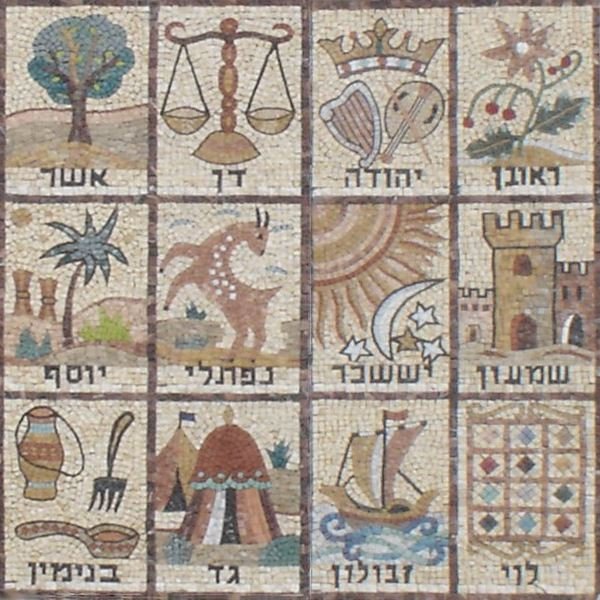 A mosaic work portraying the Twelve Tribes of Israel alongside their symbolic images.