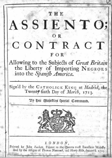 Though initially overlooked, British opposition politicians later used Jenkins’ incident to rally support for war with Spain, driven by economic motives, particularly expanding Caribbean trade and retaining the Asiento de Negros. Image: Cover of the 1713 English translation of the Asiento contract, signed as part of the Treaty of Utrecht, granting Britain exclusive rights to sell slaves in the Spanish Indies.