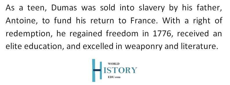 When Dumas was a teenager, his paternal grandfather died. But Antoine had no money to return to France. The trip back home was important to him because he had to claim his inheritance. To pay for his return to his home country, Antoine sold a 12-year-old Dumas into slavery for 800 livres to a French man named Captain Langlois.
