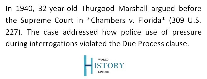 In 1940, Marshall, 32 years at the time, argued before the Supreme Court in the landmark case – Chambers v. Florida, 309 U.S. 227 (1940). The case involved analyzing how the police and interrogators’ use of pressure in some way violated the Due Process clause.