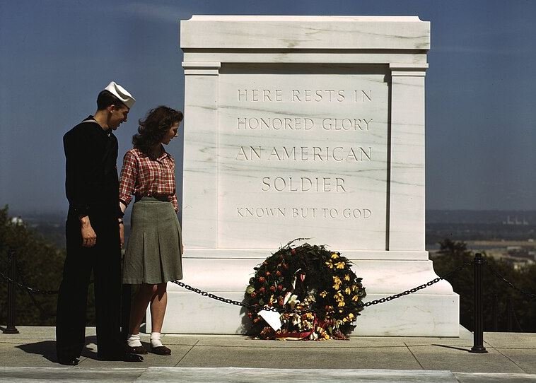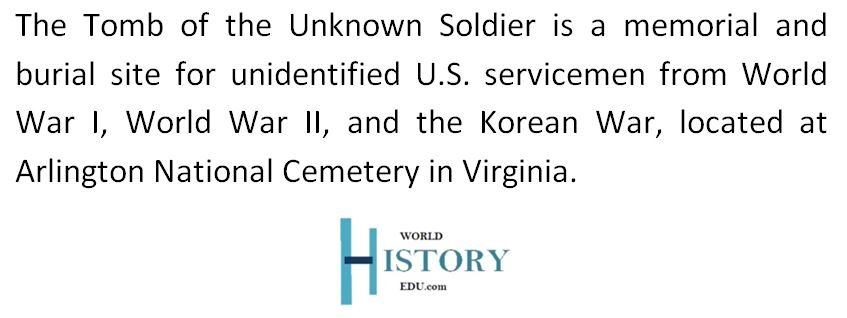 The Tomb of the Unknown Soldier, located at Arlington National Cemetery in Arlington County, Virginia, serves as a burial site and monument dedicated to unidentified U.S. servicemen who lost their lives in service to the country. Established initially to honor an unidentified soldier from World War I, it has since expanded to include soldiers from World War II and the Korean War. These unidentified soldiers are symbolically representative of all unknown and unaccounted-for military personnel.