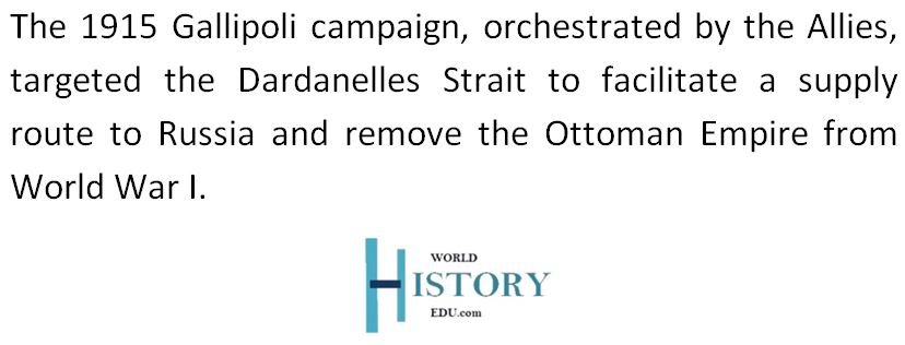 The Gallipoli campaign in 1915, led by the Allies, aimed to seize the Dardanelles to support Russia and eject the Ottomans from WWI.