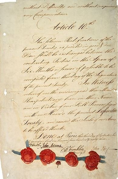 The Treaty of Paris, signed in 1783, was a monumental achievement that marked the end of the American Revolutionary War and recognized the independence of the United States. Image: The last page of the treaty.