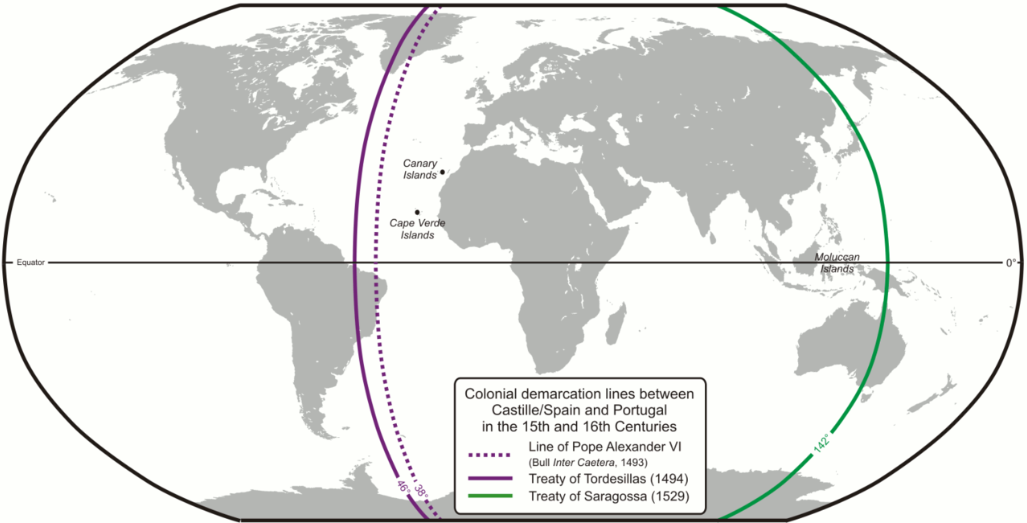 The 1494 Tordesillas meridian (purple) and 1529 Zaragoza antimeridian (green) divided non-Christian territories.