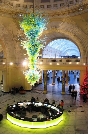 Since 2001, the museum has undergone a £150m renovation, including the opening of new European galleries in 2015 and expanding with branches like V&A Dundee, enhancing its global presence. Image: The 11-metre high, blown glass chandelier by Dale Chihuly in the rotunda at the V&A’s main entrance