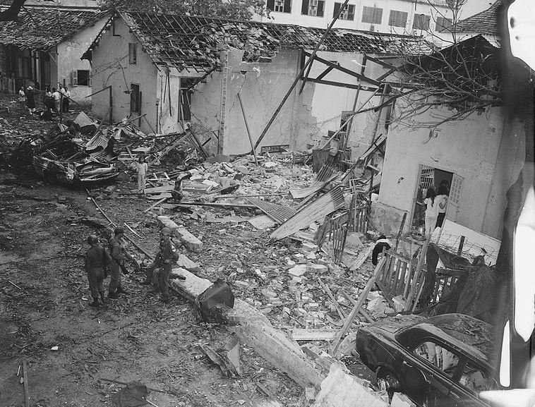 A photo showing the aftermath of a Viet Cong bombing of Brinks Hotel.
