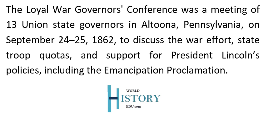 The Loyal War Governors’ Conference was a significant political event during the American Civil War. Held at the Logan House Hotel in Altoona, Pennsylvania, on September 24 and 25, 1862, this gathering of thirteen Union state governors focused on strengthening the war effort, addressing troop quotas, and reinforcing support for President Abraham Lincoln’s Emancipation Proclamation. The conference also served as a platform to critique and suggest the removal of General George B. McClellan as commander of the Army of the Potomac.