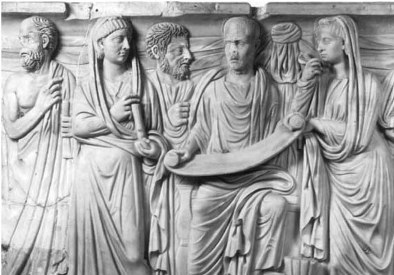 A Roman sarcophagus in the Museo Gregoriano Profano at the Vatican Museums features a depiction of Plotinus surrounded by his disciples.