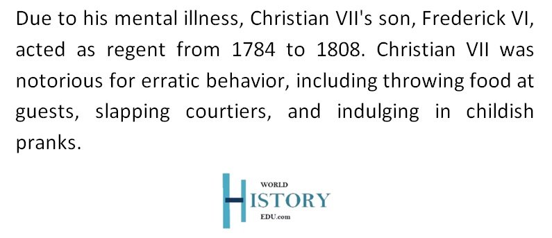 Perhaps the death of his mother when he was just three had a long-lasting impact on his mental and emotional health. Furthermore, his tutor, Christian Ditlev, Count of Reventlow, frequently beat him, permanently scarring the already frail young prince emotionally and mentally.