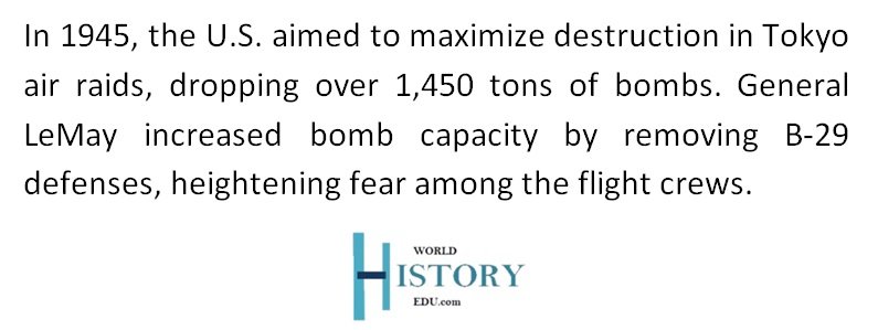 In the Tokyo air raids alone, more than 1450 tons of bombs were dropped on the city. This was largely possible because General LeMay had ordered for the removal of things deemed “unnecessary”, including the defensive parts, from the B-29 bombers so as to make for more room storage for the bombs. This decision to remove those defensive armaments left a palpable fear among the pilots and crew that were to fly the aircraft.