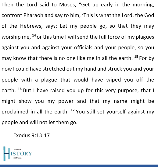 God sent the plagues, including the seventh, as a response to Pharaoh’s refusal to release the Israelites from slavery. Each plague served as a demonstration of God’s power over the Egyptian deities and was intended to compel Pharaoh to free the Israelites.