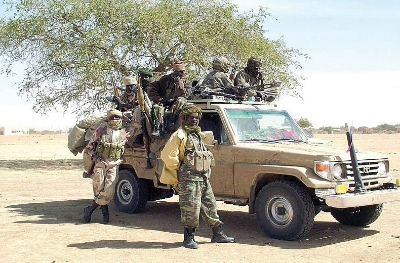 Image: Chadian military personnel pictured on a Toyota Land Cruiser pickup truck.