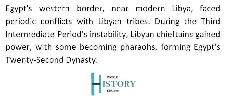 The western border of Egypt, adjacent to modern-day Libya, was historically a region where various Libyan tribes resided. These tribes often came into conflict with the Egyptians. These clashes could be over territory, resources, or other factors, and they occurred periodically throughout Egypt’s history.