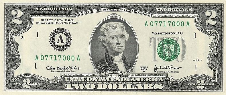 Thomas Jefferson’s face has been on the $2 bill since 1869, replacing Alexander Hamilton, who was originally featured when the bill was first issued in 1862. Image: Obverse of the $2 bill.