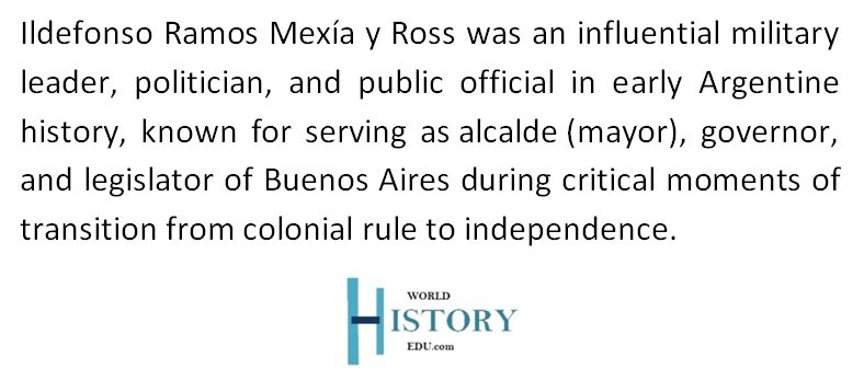 Ildefonso Ramos Mexía y Ross (August 2, 1769 – June 24, 1854) was a significant military and political figure in early Argentine history. His career spanned a period marked by profound political, social, and military upheaval as the region transitioned from Spanish colonial rule to independent statehood. Ramos Mexía’s work as a public official and leader reflected the complexities and challenges of forming a new nation amidst internal strife and external pressures.