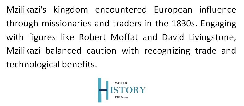Mzilikazi had complex relationships with European settlers and missionaries. While he was initially open to trade and interaction with missionaries like Robert Moffat and David Livingstone, he became increasingly wary of European intentions, especially in light of the encroachment by Boer settlers during the Great Trek.