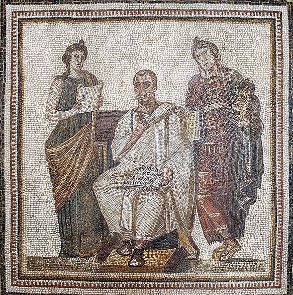 Virgil is regarded as one of the most important literary figures because of his ability to capture the spirit of his age, his influence on Western literature, and the lasting cultural and political significance of his works, especially the Aeneid. Image: Mosaic of Virgil (center) seated between Clio (left) and Melpomene (right).