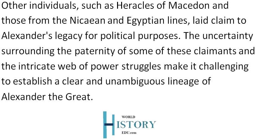 While Alexander IV was the most recognized and acknowledged son, various other individuals claimed to be the offspring of Alexander the Great, either for political reasons or to gain legitimacy. Among these claimants were those from the Nicaean Line.