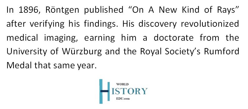 In 1896, he released a paper titled “On A New Kind of Rays” (Über eine neue Art von Strahlen) after discreetly validating his findings. His insight was immediately useful in many areas of medical imaging. For his contribution, he was awarded a doctorate of medicine from the University of Würzburg. That same year, Rontgen was presented with the Royal Society of London’s Rumford Medal.