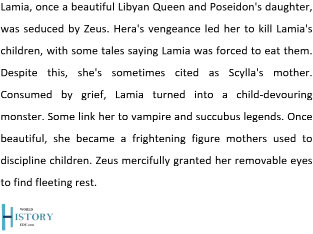 Lamia was a beautiful queen of Libya who caught the eye of Zeus, the king of the gods. Their passionate affair invoked the wrath of Hera, Zeus’s jealous wife. To punish Lamia, Hera took away or killed Lamia’s children, an act that drove Lamia into deep despair.