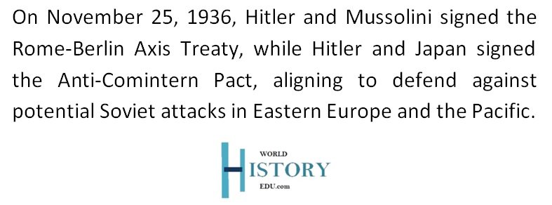 On November 25, 1936, Adolf Hitler and Italian Prime Minister Benito Mussolini signed the Rome-Berlin Axis Treaty. That same day, Hitler and the Imperial Japanese government signed the Anti-Comintern Pact. The two countries banded together in order to ward off any future attacks from the Soviet Union, either in Eastern Europe or the Pacific region.