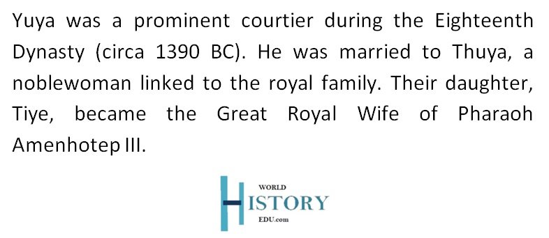 Yuya was married to Thuya, a noblewoman closely connected to the royal family. Thuya held prominent roles in the religious and administrative spheres, enhancing the couple’s status. Their union represented a strategic alliance that integrated Yuya into Egypt’s political and spiritual elite.
